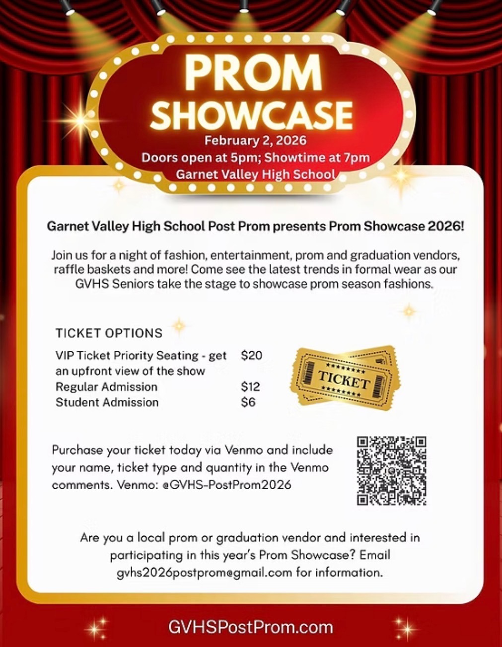 GVHS Post Prom is excited to present Prom Showcase 2026, a fun evening of fashion, entertainment, and community support. The event will be held on Monday, February 2, 2026, in the Garnet Valley High School Auditorium. Doors open at 5:00 p.m., and the show will begin promptly at 7:00 p.m.