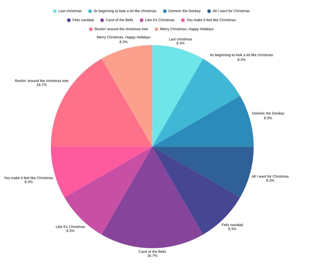 It seems the two most popular holiday songs are Carol of the Bells and Rockin’ Around the Christmas Tree! Great pricks for getting in the holiday spirit this year! Check out some of the other songs on here too if you’re looking for the absolute best songs to get you ready for the holidays!
